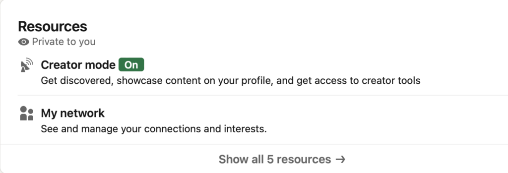 Creator mode is a shift from LinkedIn as a place to build relationships to showcasing content. When creator mode is off, one of the first things people see on your profile is your headline and Information section, both of which tell the story of who you are and what your company does. Articles you've written will also be displayed more prominently when creator mode is on.