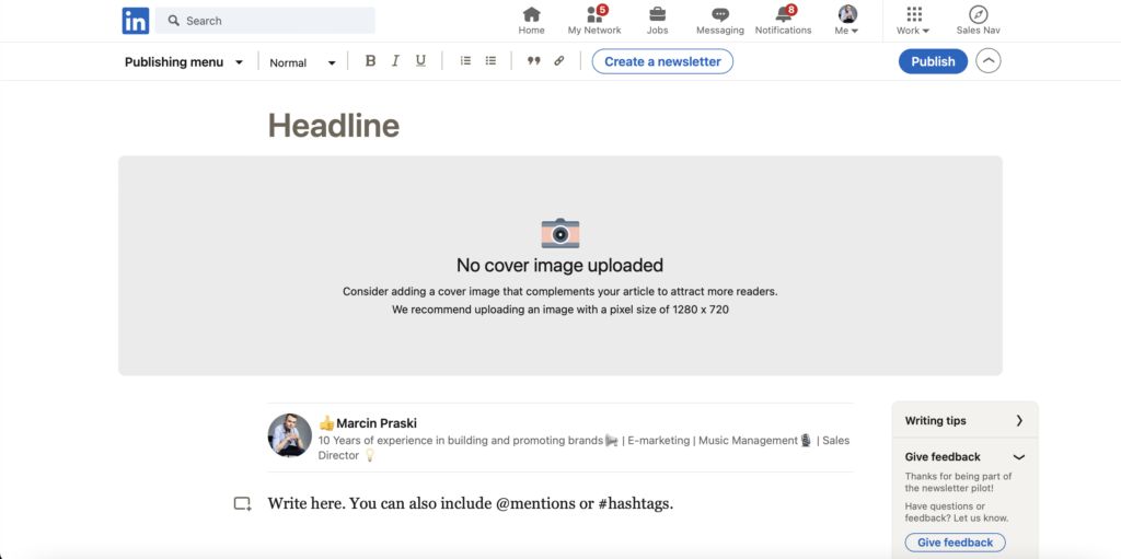 Here we have the option to attach a background photo to our article. In the lower right corner, we can see tips for writing an article. From here we can also create a newsletter on LinkedIn.
