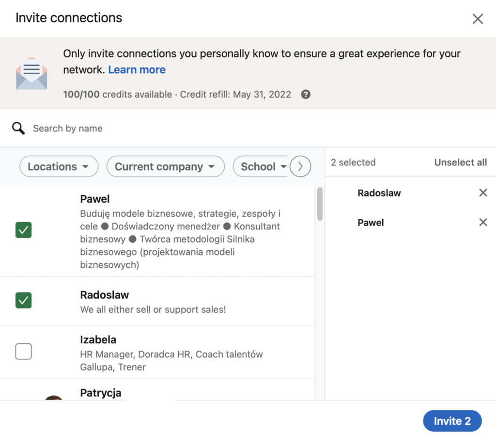Since LinkedIn replenishes credits on the first day of each month, it's a good idea to use all credits at the beginning of each month. As people accept your invitation to follow the page, you will have more time to use up the new credits! Therefore, it is important to choose the right people, those who will definitely accept your invitation 🙂