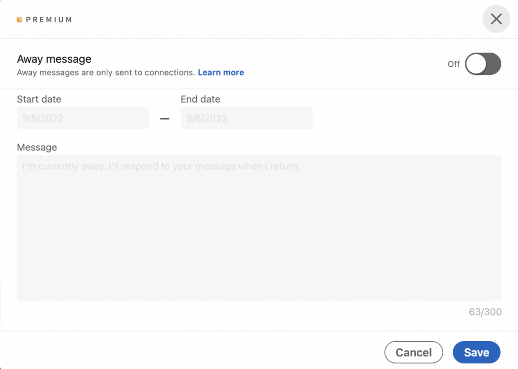 When we have purchased premium on LinkedIn, we can also set ourselves an automatic message informing us of our absence when we are unavailable. We choose the date from - to, when the message should be sent, and we can also select whether the message should be sent only to 1st degree contacts or also to 2nd and 3rd degree contacts.