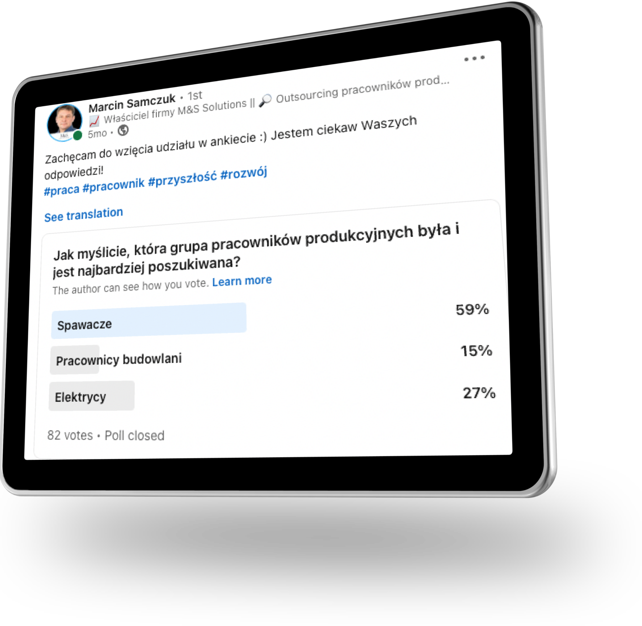 Creating and maintaining a personal profile on LinkedIn in such a way that as many of Marcin's network as possible saw, reacted to, commented on a post or took a survey. Marcin hoped to increase the visibility of his brand among people in his network and to gain an additional few leads per month through such activities.