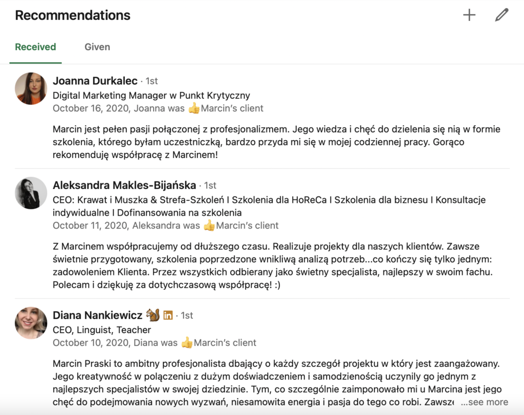 Before I start a campaign on my client's account, I first audit their profile. Why? I'm already explaining! A personal profile on LinkedIn is not the same as a Facebook profile or other social media. Unfortunately, many people upload residual information about themselves there - usually their current position, graduate school and a profile picture. However - this is a shot in the knee and misses a huge potential. A professional personal profile is a huge step towards social selling, giving us a chance for growth and brand recognition, as well as building relationships with partners and customers.